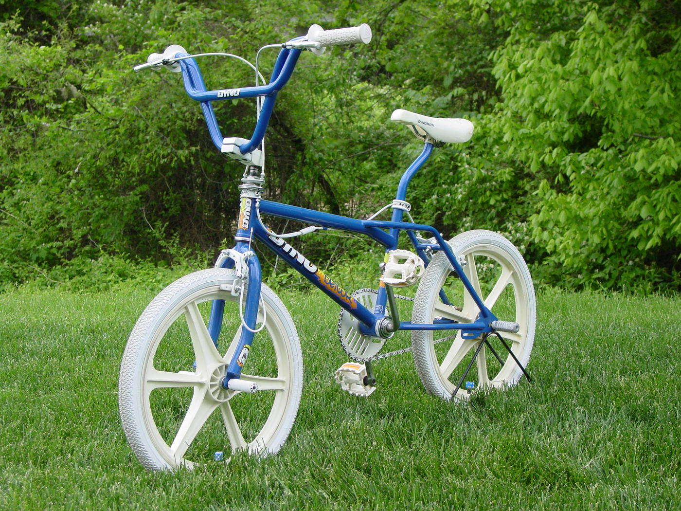 Vintage BMX from 1989 in striking blue with iconic white mag wheels. Original Dyno De Tour components in excellent condition, perfect for collectors or enthusiasts of classic BMX bikes.