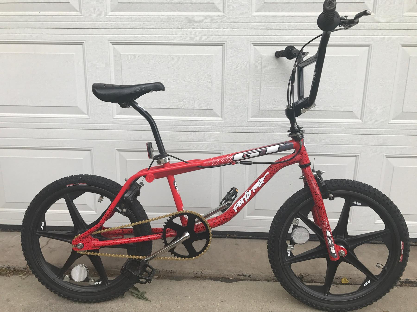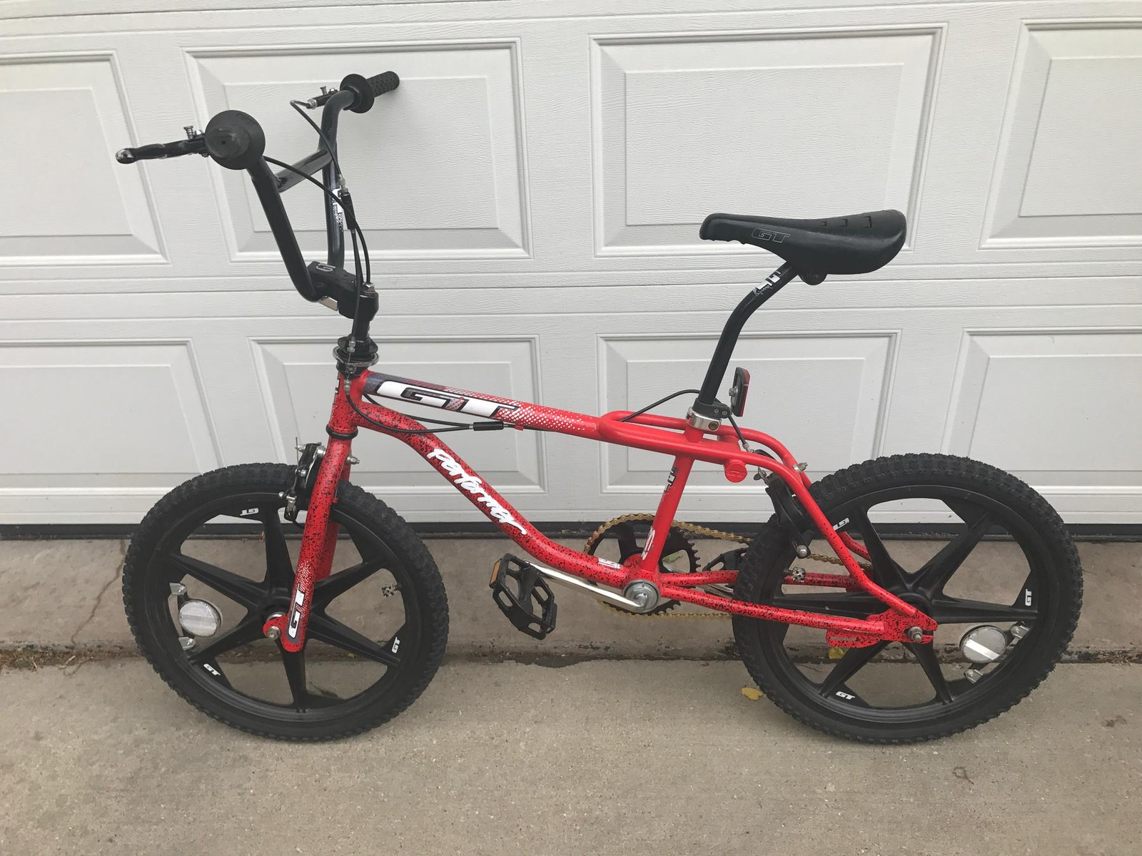 Classic 90s BMX in striking red with black wheels. Original GT Performer components in excellent condition, perfect for collectors or anyone looking for authentic vintage BMX style.