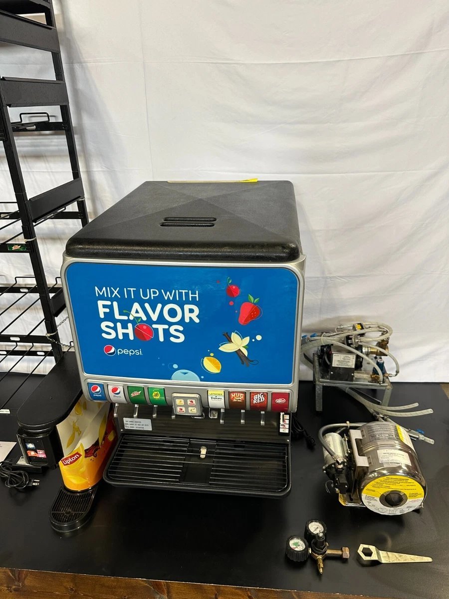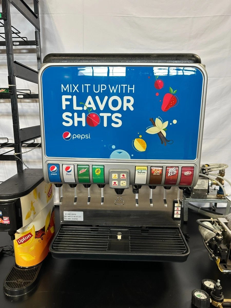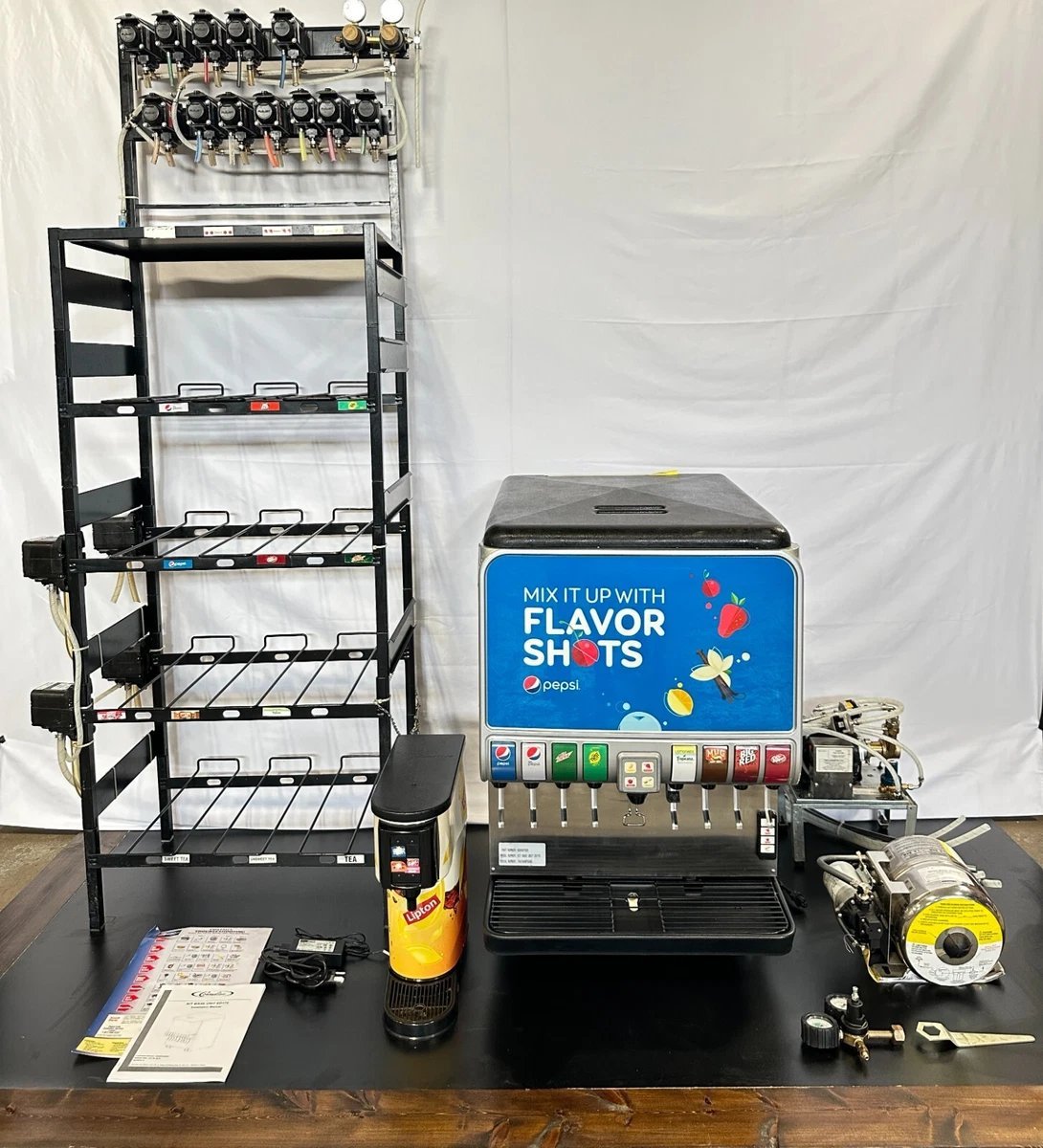 The Flavor Shots Ice Soda Fountain Machine, featuring 8 drinks and a tea dispenser, is a high-capacity, multi-functional commercial unit designed to provide a range of beverage options for high-traffic environments, such as restaurants, cafeterias, and convenience storescomprisesystem includes 8 drinks, as well as a tea dispenser, and utilizes Flojet pumps and a Bib rack for syrup delivery. It’s perfect for businesses looking to offer a variety of sodas, flavored drinks, and iced teas to their customers.