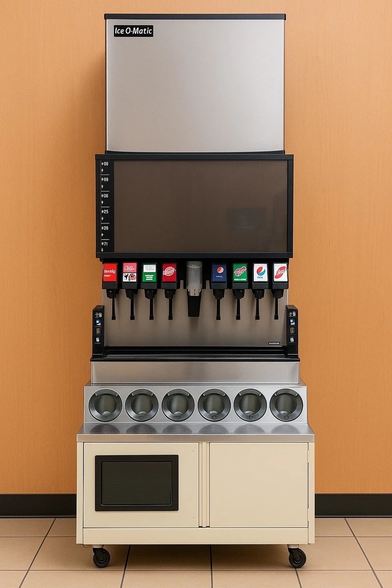 The Lancer Soda Fountain & Ice-O-Matic Ice Maker Combo is a dual-purpose commercial unit designed to combine both soda fountain dispensing and ice production in one compact solution. This combo system is perfect for high-traffic areas like restaurants, cafes, bars, and convenience stores, providing both cold beverages and ice without requiring two separate machines. Here’s an overview of what this combo system offers:
