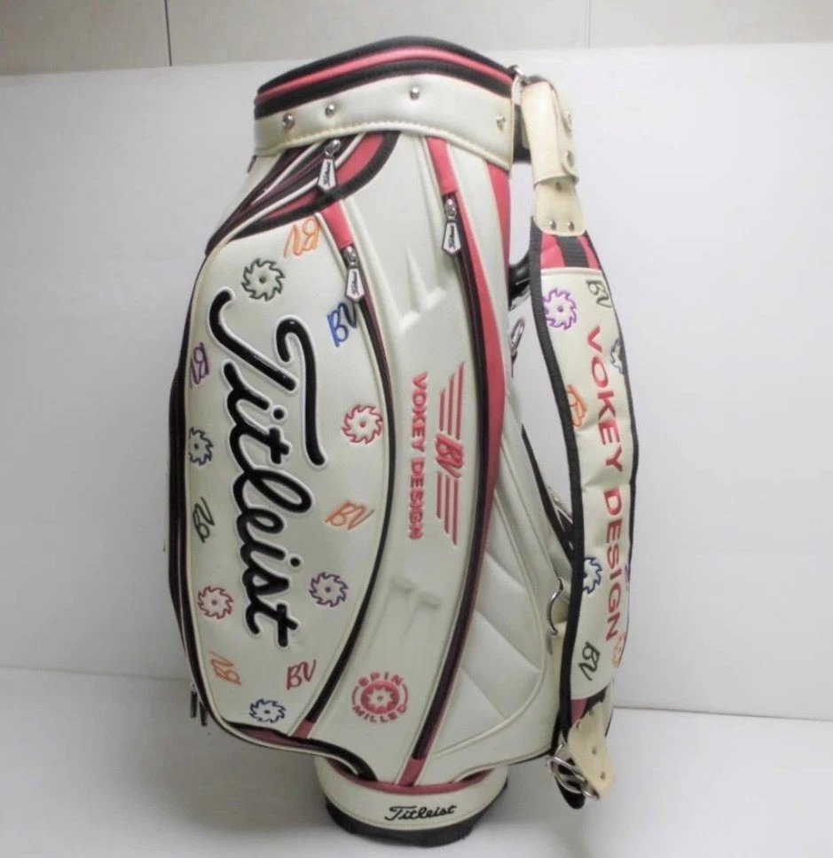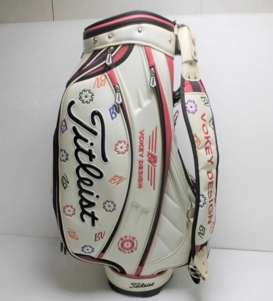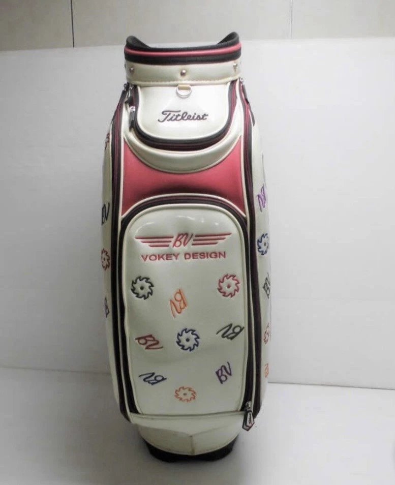 An exclusive, tour-inspired staff bag crafted from premium custom leather, this limited-edition Titleist Vokey Design BV model showcases refined Japanese-market detailing in a clean white finish. Designed with the serious golfer and collector in mind, it features bold Vokey branding, spacious multi-pocket storage, reinforced structure, and a professional staff silhouette seen on tour.