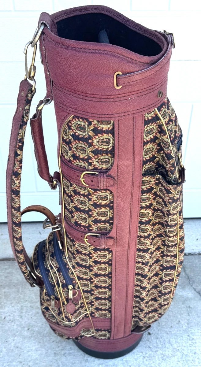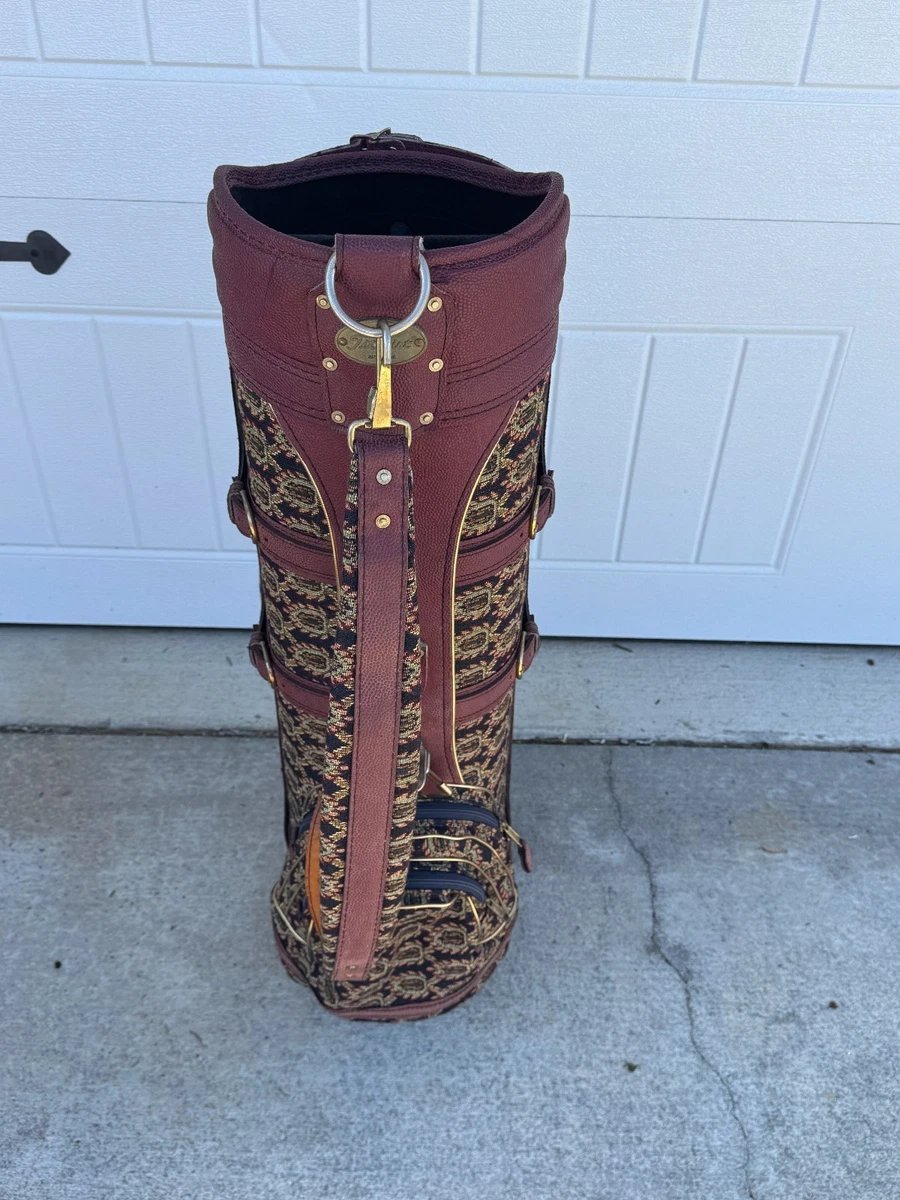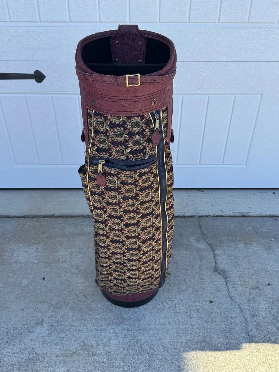 Classic style meets collectible charm. This vintage Titleist cart bag features a distinctive tapestry pattern, offering both elegance and durability. Included are matching head covers and a rain cover to protect your clubs in all conditions. Well-maintained and visually striking, it’s perfect for collectors or golfers who appreciate retro-inspired gear with both functionality and style.